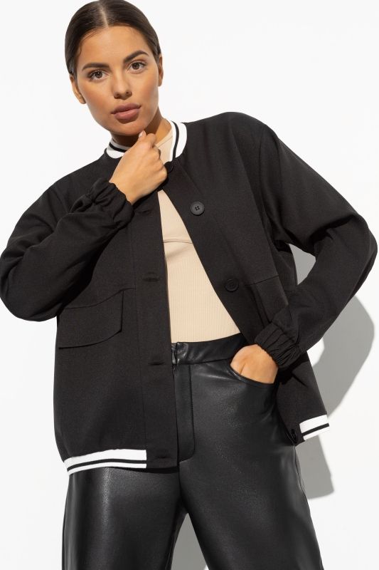 Бомбер чёрный на пуговицах от компании Charutti. Модель свободного силуэта, выполнена из костюмной ткани "барби". Круглый вырез горловины. Длинные втачные рукава на резинке. По бокам удобные карманы. Бомпер на подкладе. Идеальный выбор для создания стильного образа.