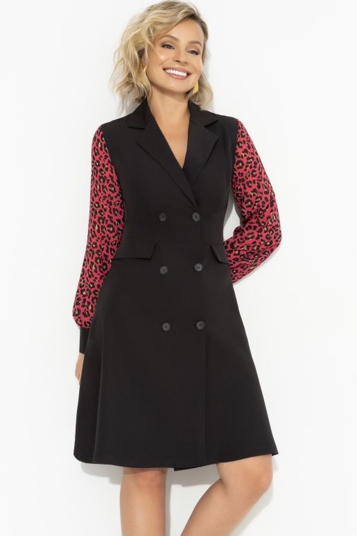 Платье чёрное на запах с рукавами из шифона с леопардовым принтом от компании Charutti. Модель полуприлегающего силуэта, выполнена из костюмного полотна "барби". V-образный вырез горловины, дополнен лацканами. Втачной, длинный рукав на манжете. Спереди имитация карманов, застёжка на пуговицы. Низ ровный, без разрезов. Это Ваш отличный образ, в котором вы всегда чувствуете себя уверенно.