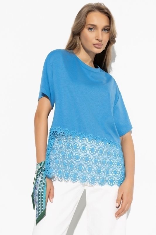 Футболка трикотажная голубая с отделкой из кружева
