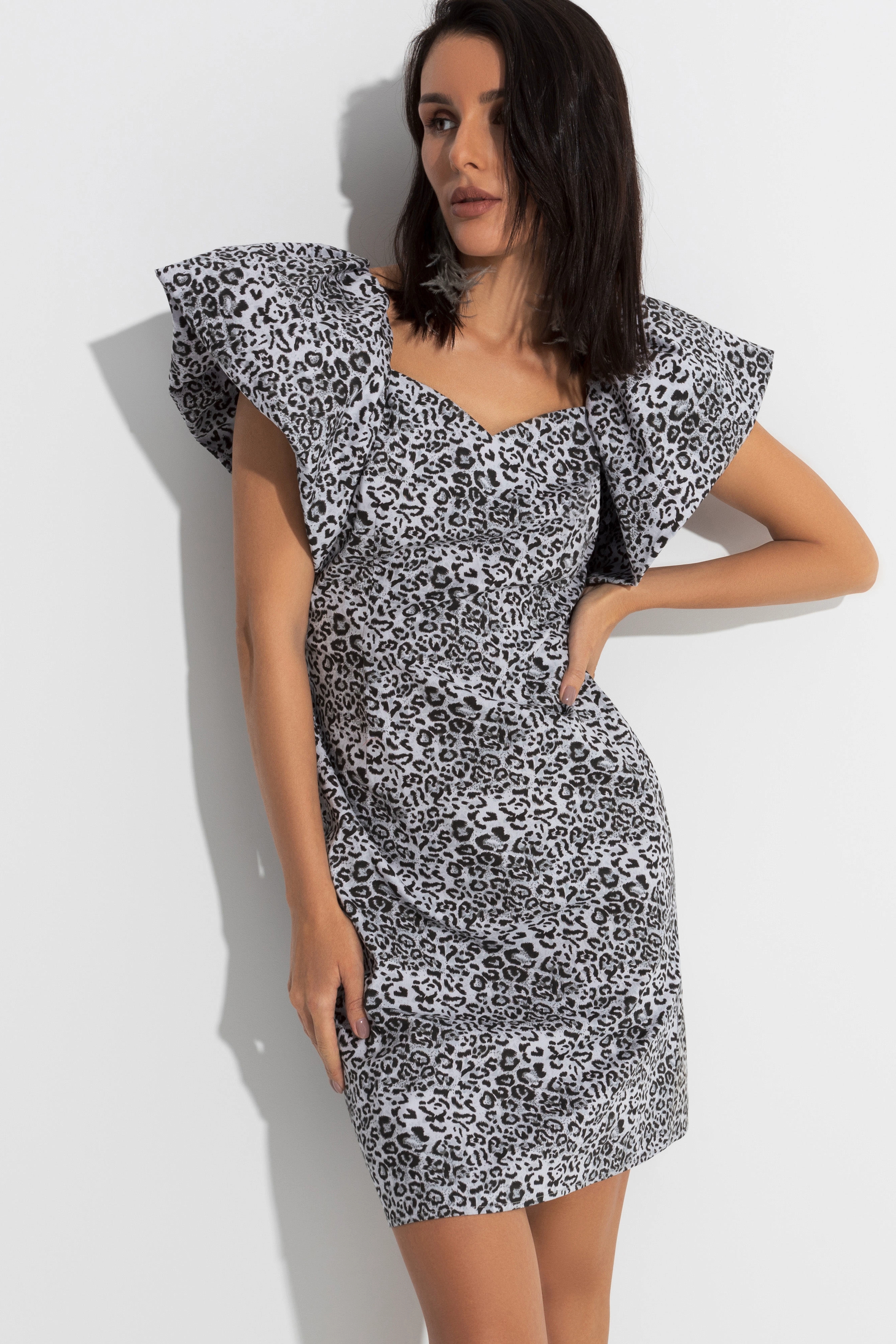 Красивое женское платье от бренда Charutti. Модель полуприлегающего силуэта, выполнена из ткани "хлопок-стрейч" в сером цвете. Фигурный вырез горловины по переду и квадратный по спинке с завязками. Втачные, объёмные, короткие рукава. Идеальный выбор для создания женственного образа.