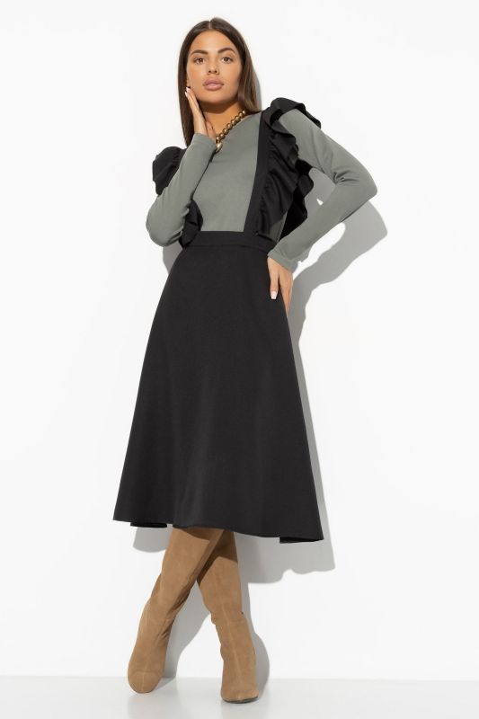 Сарафан чёрный со съёмными лямками-рюшами от компании Charutti. Модель полуприлегающего силуэта, выполнена из костюмного полотна "барби". Сарафан можно носить как юбку. Лямки крепятся на пуговицы, не регулируются. Скрытый замок на юбке по задней части изделия. Это Ваш отличный образ, в котором вы всегда чувствуете себя уверенно.