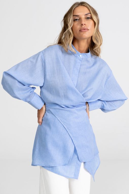 Голубая рубашка-трансформер от бренда Charutti. Модель полуприлегающего кроя, выполнена из блузочной ткани "марлёвка". Горловина оформлена воротником-стойкой. Втачные рукава, длинные с манжетом. По спинке резинка. По переду супатная планка с застёжкой на пуговицы. Отличный выбор для деловой встречи.