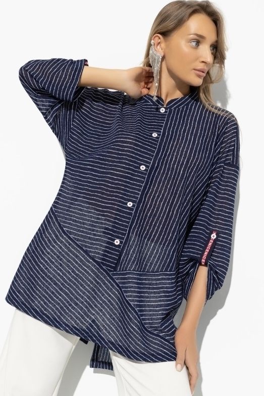Трикотажная синяя блузка с асимметричным низом