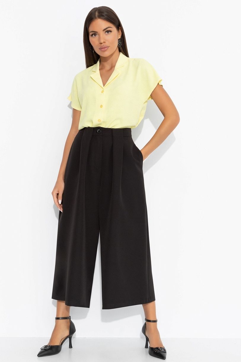 Кюлоты чёрные с дизайнерскими шлёвками от компании Charutti, выполнены из костюмного полотна "Барби". Широкие, посадка на талии. Изделие застегивается на пуговицу и молнию. Дизайнерские шлевки-защипы по верхней части изделия. Кюлоты с карманами. Идеальный выбор для городских модниц.