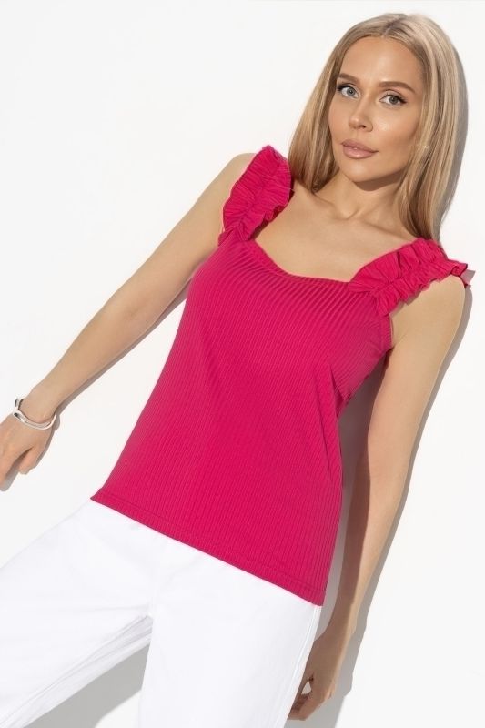 Топ трикотажный цвета фуксии от компании Charutti. Модель полуприлегающего силуэта, на широких бретелях. Фигурный вырез горловины. Идеальный выбор для Вашего стильного гардероба.
