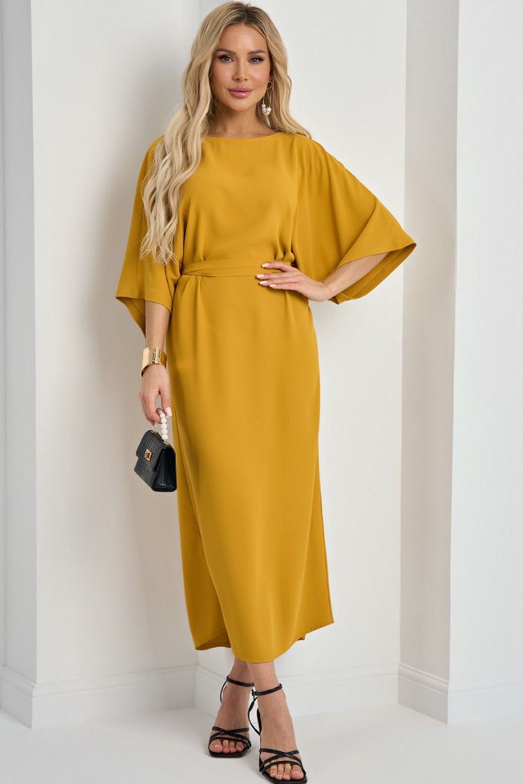 Платье длинное горчичного цвета с поясом