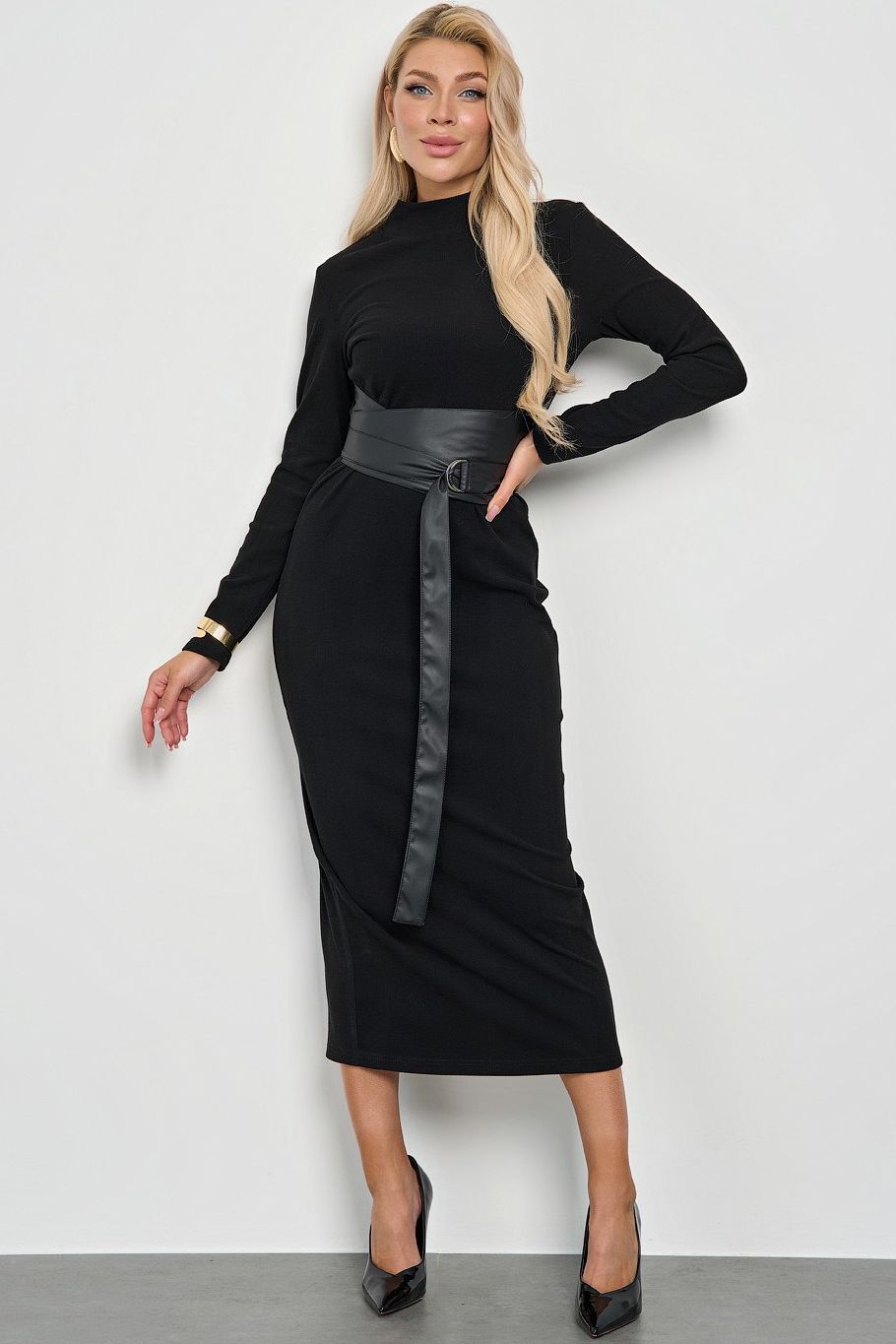 Платье трикотажное чёрное длинное от производителя Jetty. Модель полуприлегающего силуэта. Длинные втачные рукава. Воротник-стойка. Спинка изделия со средним швом и шлицей сзади. Пояс из искусственной кожи с пряжкой-полукольцом вшит в боковые швы изделия. Стильный вариант на каждый день.
