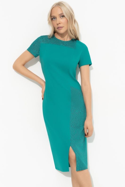 Платье-футляр трикотажное зелёного цвета от компании Charutti. Модель прилегающего силуэта, выполнена из «трикотаж «жаккард», трикотаж «скуба-креп». Горловина оформлена круглым вырезом. Короткие втачные рукава. Миниатюрная застежка-пуговица по спинке изделия. По переду небольшой разрез. Это Ваш отличный образ, в котором вы всегда чувствуете себя уверенно.